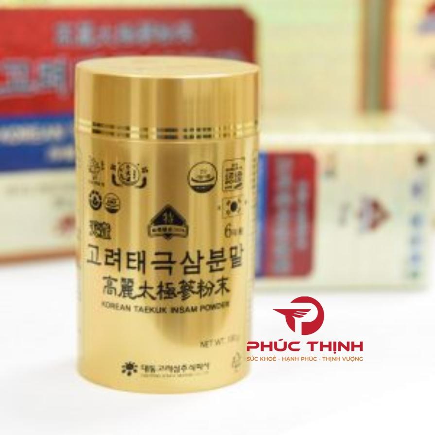 Bột sâm taekuk 100% (Ginsenoside Rg1, Rb1 4mg/g), gồm 70% rễ chính và 30% rễ phụ.