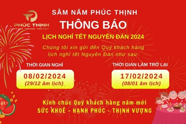 📌 Thời gian nghỉ: Từ ngày 08/02/2024 (tức 29/12 âm lịch). Thời gian đi làm trở lại: Ngày 17/02/2024 (tức 08/01/2024 âm lịch)
