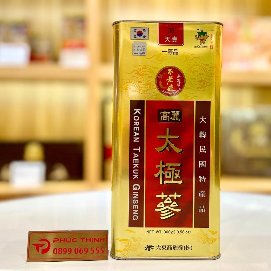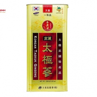 Thái cực sâm là dạng nhân sâm được hấp sấy nhiều lần để tăng hàm lượng hoạt chất, đặc biệt là saponin. Sản phẩm thái cực sâm củ khô hộp thiếc 300g của Daedong Hàn Quốc được chế biến từ sâm 6 năm tuổi, đóng gói theo quy chuẩn, dùng phổ biến trong chăm sóc sức khỏe.